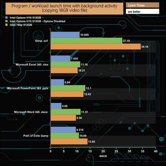 In the reviewer's guide that accompanied the Optane Memory H10 module were some suggestions from Intel to test some real-world scenarios found in Intels Representative Usage Guides (RUGs). This involved opening/loading various projects into applications while at the same time copying an 18GB video file between folders on the system using a stopwatch to record the time. The applications used were GIMP, Microsoft Excel 365, Microsoft PowerPoint 365 and Microsoft Word 365. We also timed the launch time of the game, Path of Exile.