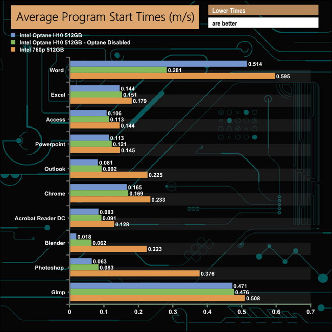We also timed the start times of a selection of programs with the AppTimer app using the H10 with the Optane memory enabled and disabled as well as the Intel SSD760p to show if the Optane technology makes any difference. The answer is yes, it does, but remember we are talking milliseconds here, so it maybe not that noticeable at all in many cases.