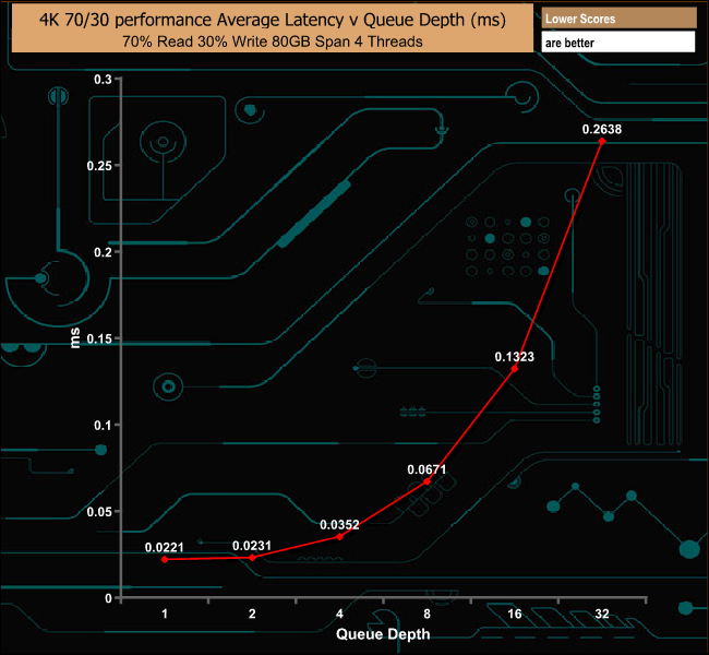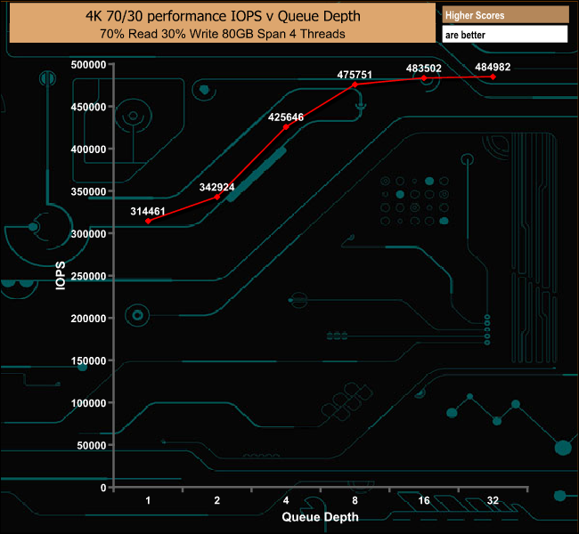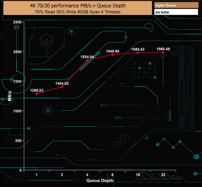 The drive produced strong performance throughout the queue depth range in our mixed read/write test.