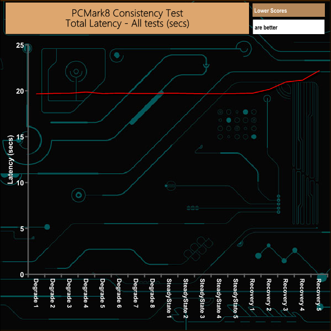 For PCMark 8's Consistency benchmark, the overall performance is stunning. The most surprising thing about the overall results is that the only time the performance really starts to drop is, oddly, during the recovery stages.