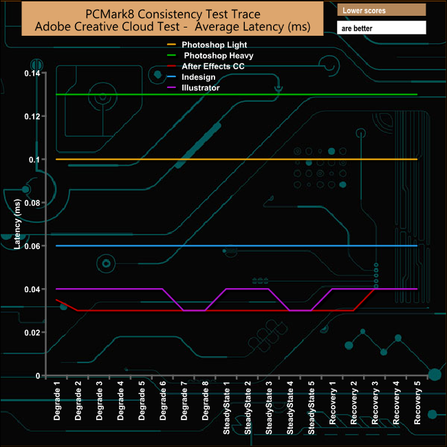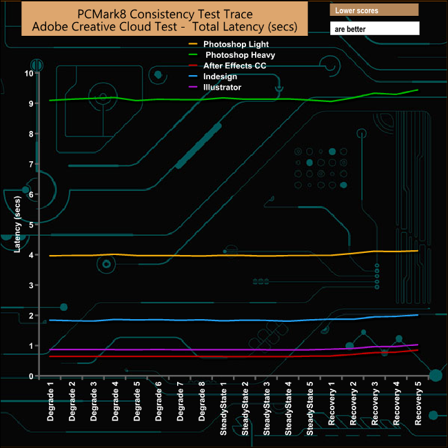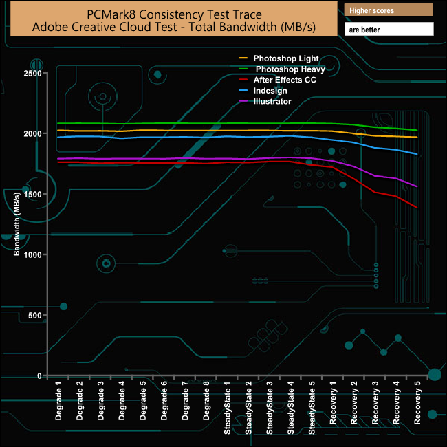 You won't often, if hardly ever, see results in the Adobe CC test runs looking like this. The drive loses hardly any performance during the most intensive parts of the tests. The only drop in performance for all five test traces comes during the recovery phases.