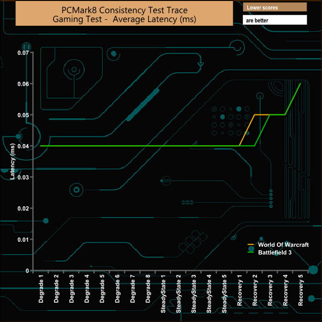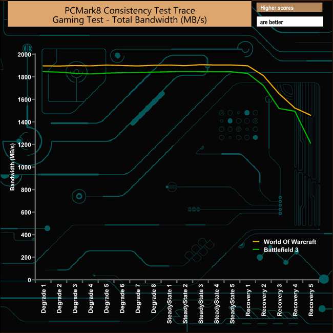 The casual gaming test shows exactly the same pattern as the other two test suites; strong and consistent performance during the intensive first two parts of the test run with the drive only showing signs of distress during the recovery phases.