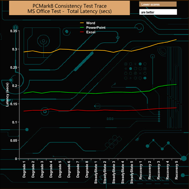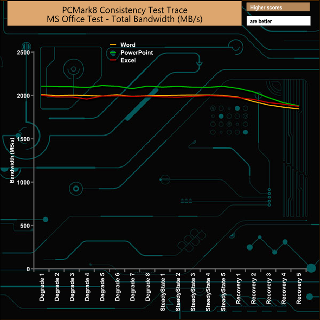 As with the Adobe tests, the Microsoft Office tests display amazingly consistent performance during the Degradation and SteadyState phases of the test run. As before, the drive loses performance during the recovery phases of the benchmark.