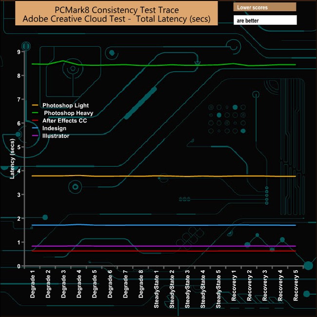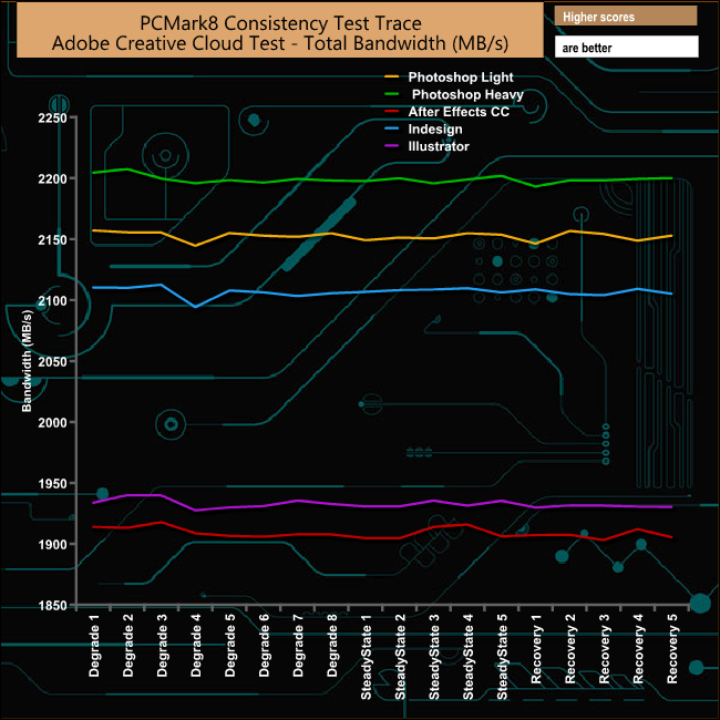 The drive produces some very strong and equally consistent bandwidth figures in the Adobe CC tests along with some low latency figures. The Adobe Photoshop Heavy trace which normal causes a drive problems is dealt with ease, averaging bandwidth figures of 2,199MB/s for the Degradation stages, 2,198MB/s for the five Steady State stages and 2,151MB/s for the Recovery phase.