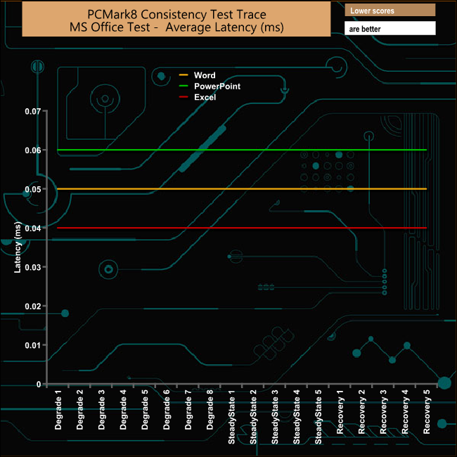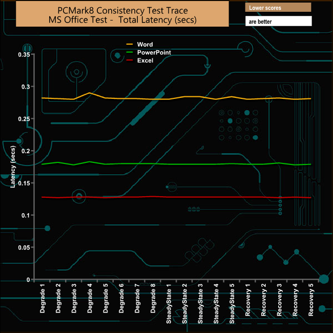 As with the Adobe CC tests, the Microsoft Office test traces were dealt with without seemingly stressing the drive at all. Even the Word test trace which, more often than not, causes a drive to drop bandwidth is dealt with without any difficulty.
