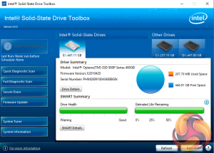 The Intel Toolbox SSD management utility is a pretty comprehensive tool for looking after your SSD. The home screen displays information about the drive, how the capacity is being used, its health and estimated life remaining.