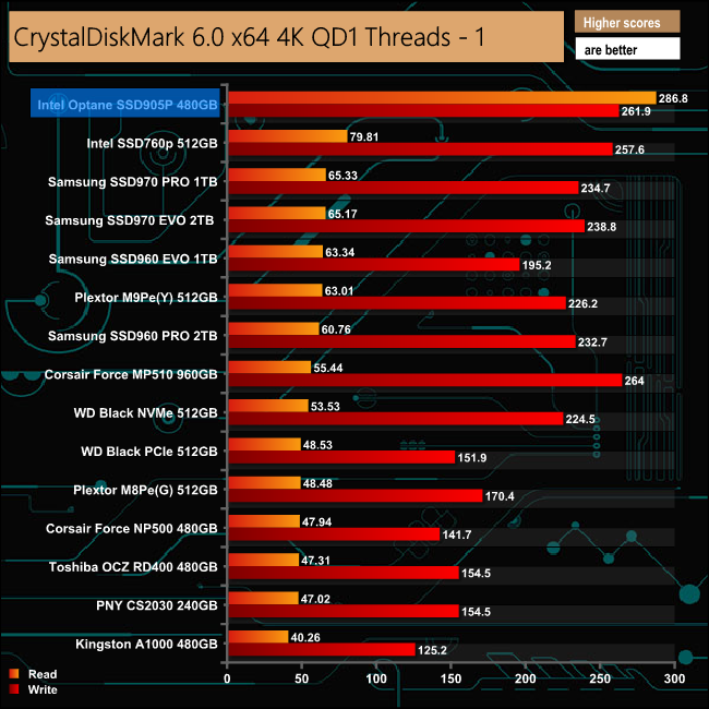 However, testing the drive at a QD of 1 proves the effectiveness of 3D XPoint memory with a stunning read test result of 268.8MB/s, three and a half times faster than the nearest NAND equipped drive – Intel's own SSD760p.