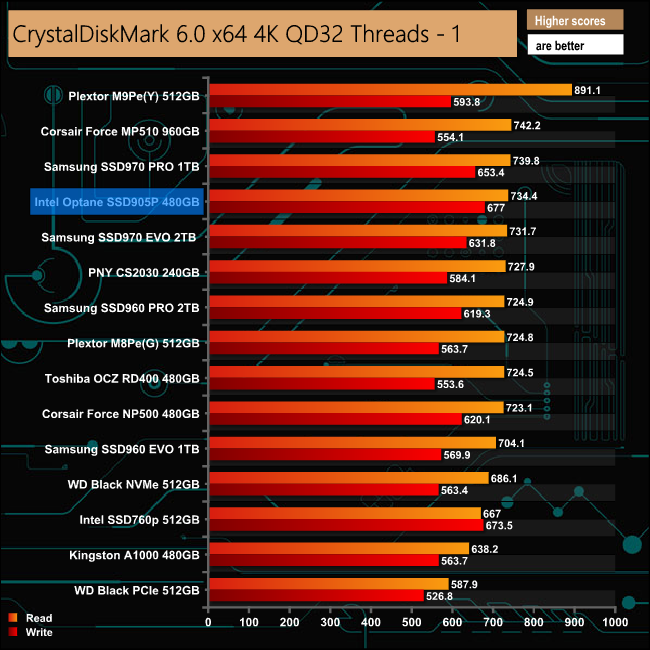 Intel's 3D XPoint memory is all about very high random performance at low queue depths, particularly read's, something perfectly illustrated by the two sets of CrystalDiskMark results. At a QD of 32 the drive sits behind the Plextor M9Pe(Y), the Corsair Force MP510 and Samsung's SSD970 PRO.