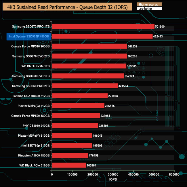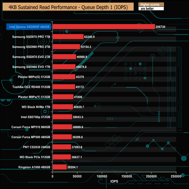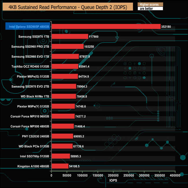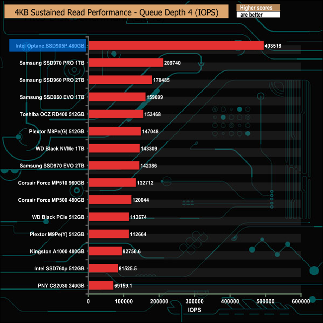 While the SSD 905P may not be breaking any speed records when it comes to Sequential performance, it's an entirely different matter when it comes to reading small chunks of data at low queue depths. It's an absolute monster, kicking sand in the face of every other consumer drive we've tested.