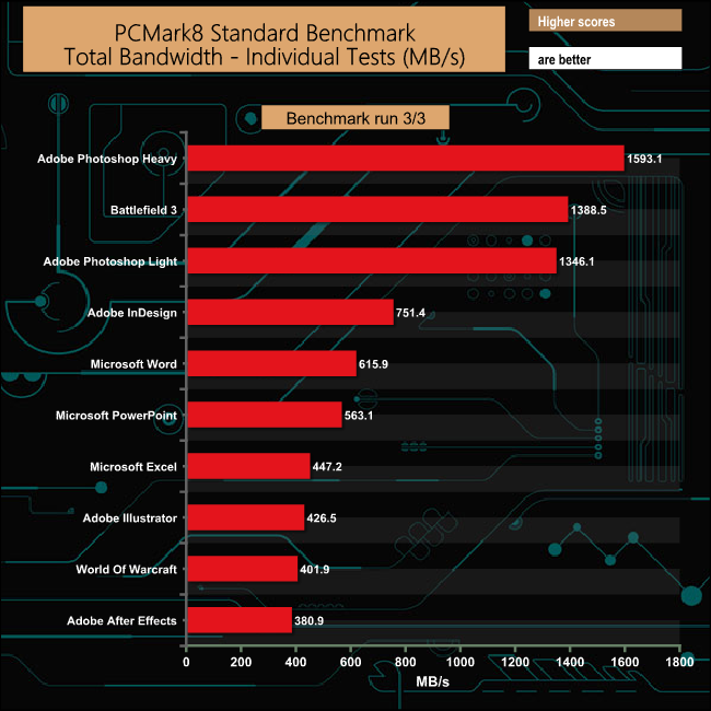 Futuremark's PCMark 8 Standard Storage test saves a large amount of performance data. The default test runs through the test suite of 10 applications three times. Here we show the total bandwidth performance for each of the individual test suites for the third and final benchmark run.