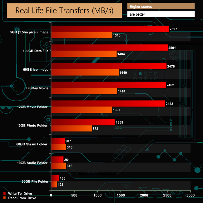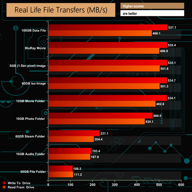 The drive deals with large files much more efficiently than the smaller files of the 60GB Steam, 50GB File and 10GB Audio folders.