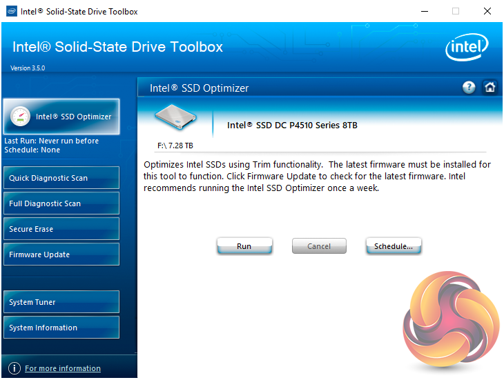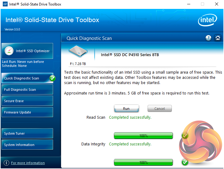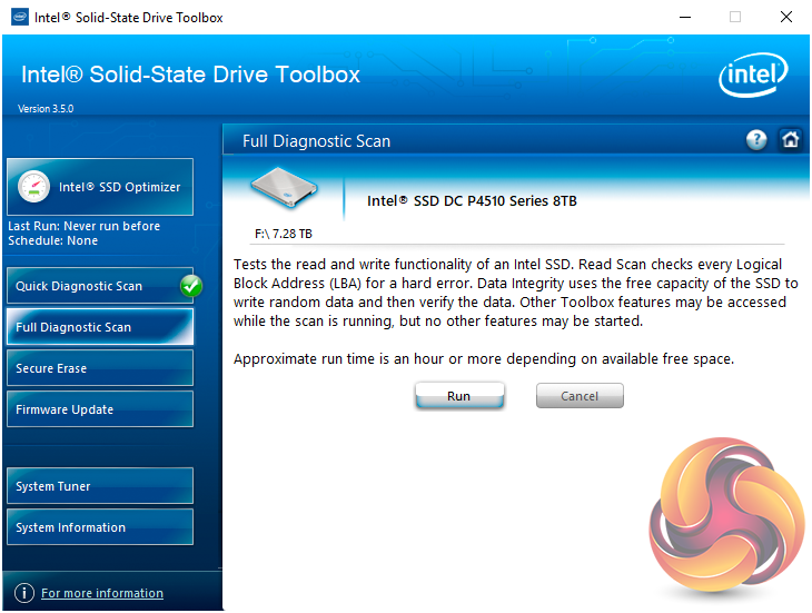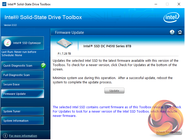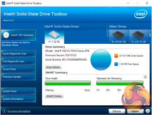 Intel's Toolbox SSD management utility supports the DC P4510 and is a pretty comprehensive tool for looking after your SSD. The home screen displays information about the drive, how the capacity is being used, its health and estimated life remaining.