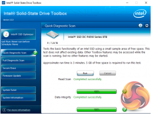 There are seven buttons on the right hand side of the utility main screen. These are for Intel’s SSD Optimizer, two drive diagnostic scans, one quick the other full, secure erase, firmware updates, a system tuner and a page for system information.