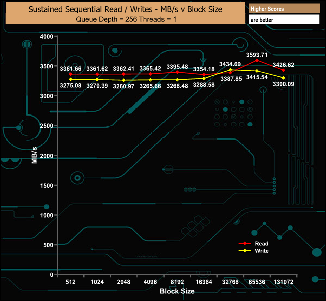As with the ATTO benchmark, in our sustained Sequential read/write versus block size tests, the drive outperformed the official figures with the reads peaking at 3,593.71MB/s while the best write figure achieved was 3,415.54MB/s.