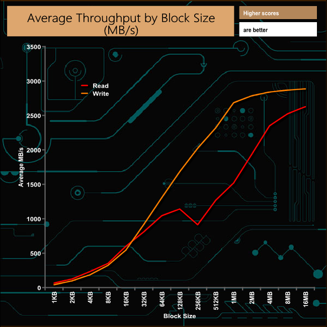 In our throughput test the drive produces a smooth performance curve for writes, peaking at the end of the test run at 2,885.93MB/s. The read curve is nowhere near as smooth with a sizable drop in performance at the 256KB block size. However, the drive recovers well to peak at 2,627.92MB/s at the end of the test.