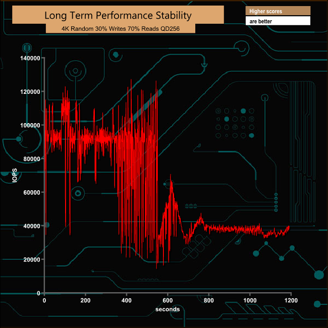For the long term performance stability test, we set the drive to run a 20-minute 4K random test with a 30% write, 70% read split, at a Queue Depth of 256 over the entire disk. The 480GB Kingston A1000 averaged 61,923 IOPS for the test with a performance stability of 53%, which for an entry level drive is pretty good.