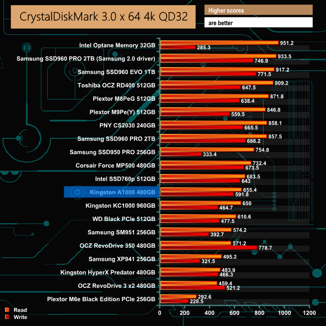 Kingston's A1000 480GB drive isn't quite as fast as the last entry-level NVMe drive we looked at, Intel's SSD 760p, but it is still a relatively quick drive considering its price. The Phison PS5008-E8 controller seems to have a preference for compressible data when it comes to read performance, something which is demonstrated by the slightly different tests run by the older V3.0.3 compared to CrystalDiskMark V6.0.