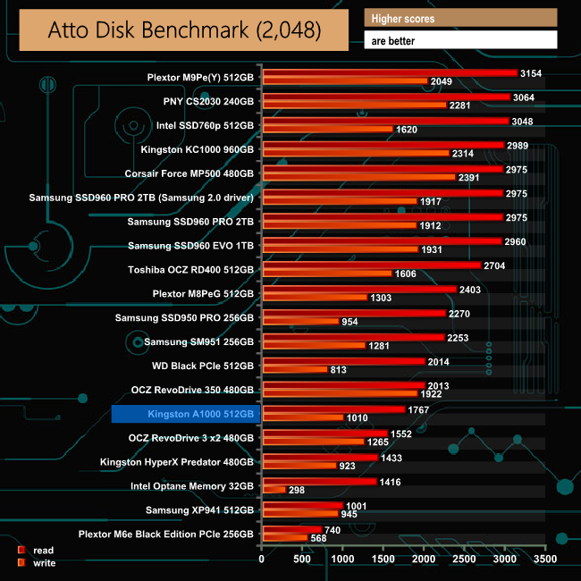 The official sequential read/write figures for the 480GB A1000 are up to 1,500MB/s and 900MB/s, numbers we could confirm and indeed even better with the ATTO benchmark. Our review drive produced a read performance of 1,767MB/s with writes coming in at 1,010MB/s.