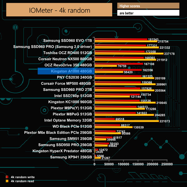 We test with both random read and write 4K tests. There are many ways to measure the IOPS performance of a SSD, so our results will sometimes differ from manufacturers' quoted ratings. We do test all drives in exactly the same way, however, so the results are directly comparable.