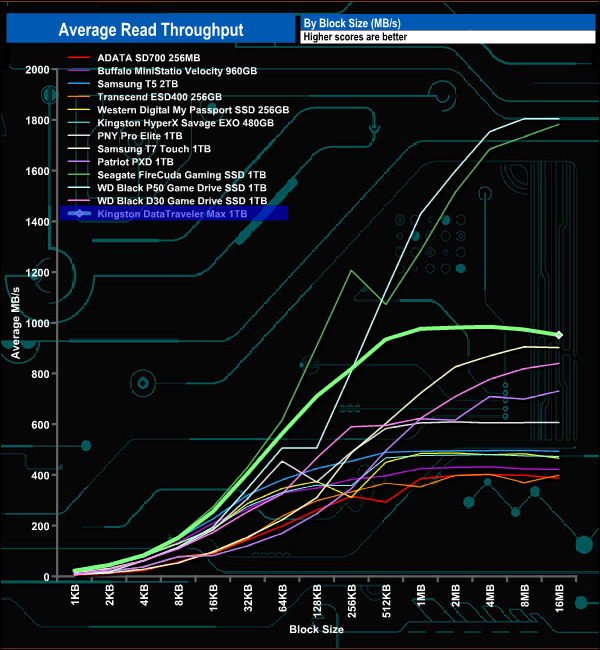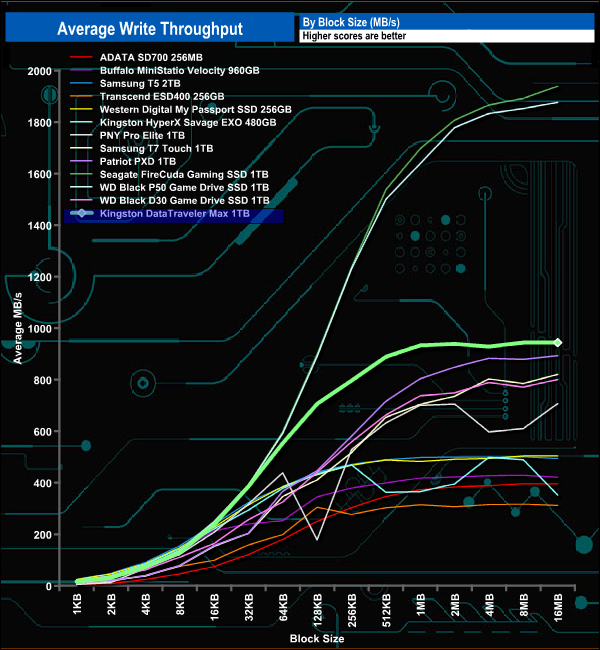 The Kingston DataTraveler Max peaked in read throughput test at 984.51MB/s (4MB block), just shy of the official maximum of 1,000MB/s. However, that figure may be just short of the official maximum but makes the drive the fastest USB 3.2 Gen2 drive we've tested to date.