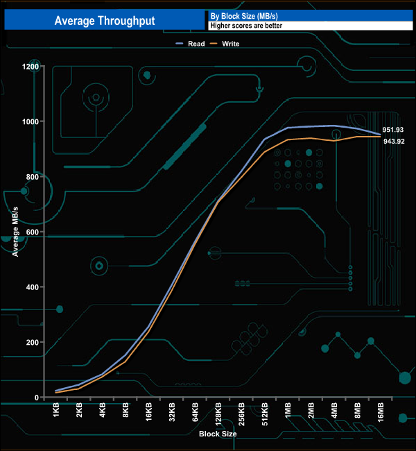 In our throughput test, reads peaked at 984.51MB/s (4MB block) before slipping back to finish the test at 951.93MB/s. Writes peaked later (8MB block) at 984.51MB/s before finishing the test run at 943.02MB/s.
