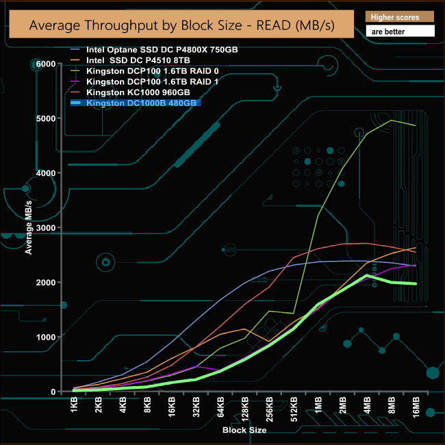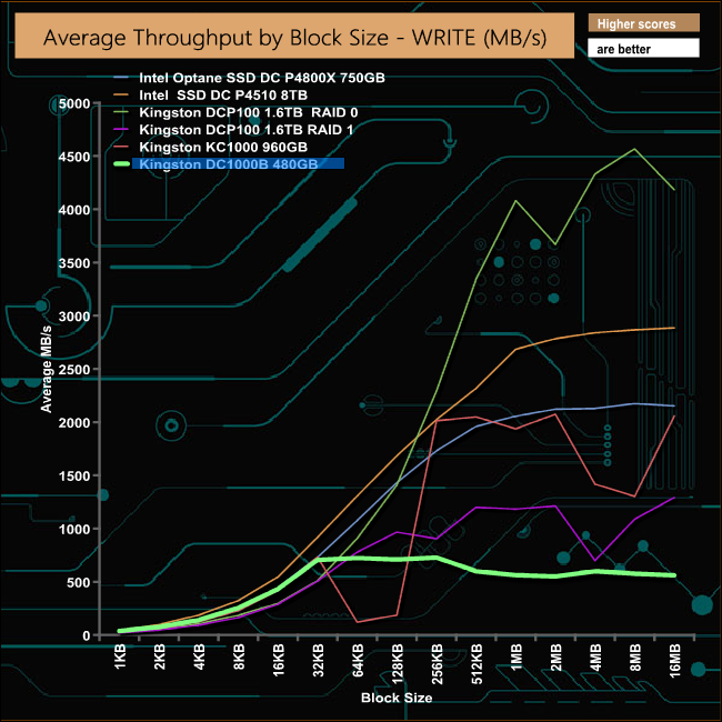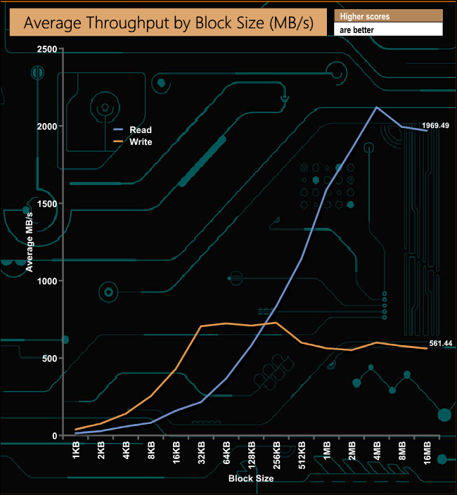 In our read throughput test, the drive peaked at 2,121.17MB/s at the 4MB block mark, somewhat short of the maximum 3,200MB/s quoted by Kingston. Writes peaked at the 64KB block size at 724MB/s, over 150MB/s faster than the official figure of 565MB/s before dropping back to finish the test run at 561MB/s.