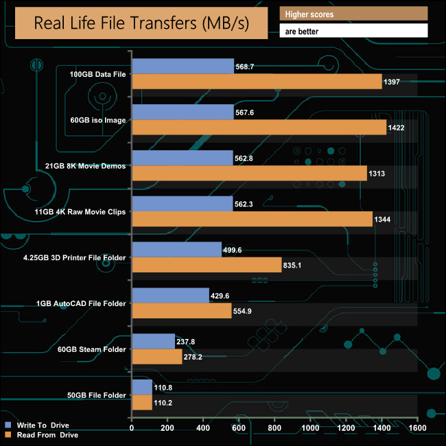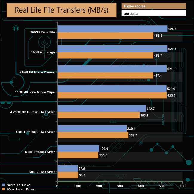 Taking the SATA SSD out of the picture and switching over to transfer the files to and from the NVMe drive shows a huge leap in read performance with a much smaller gain in writes when dealing with larger file sizes.