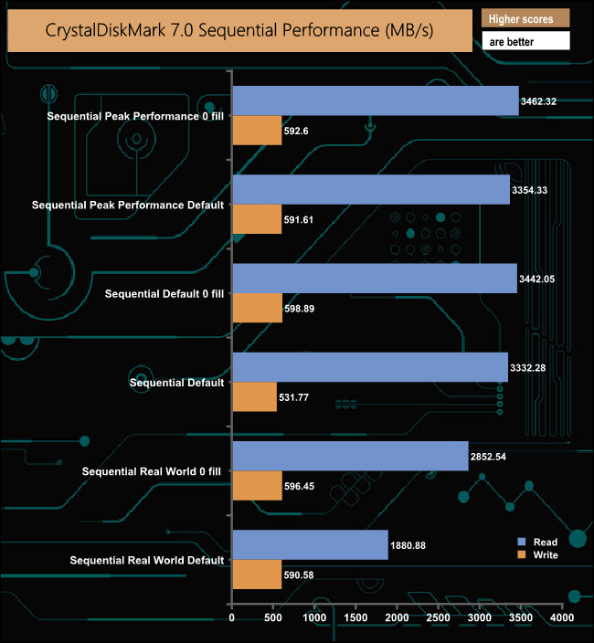 The latest version 7 of CrystalDiskMark includes a couple of profiles that can be used for testing along with the standard tests, Peak Performance and Real World. In both the standard and Peak Performance tests, the drive passed the official read Sequential ratings of 3,200MB/s. Using the Real World profile the Sequential read performance dropped to 2,852MB/s and 1,880MB/s when using compressible and incompressible data respectively.