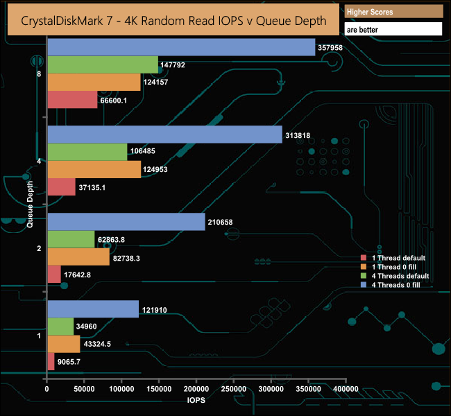 Looking at the two sets of CrystalDiskMark result screens it appears that the Phison PS5012 controller is much more efficient when reading compressible data at certain queue depths.
