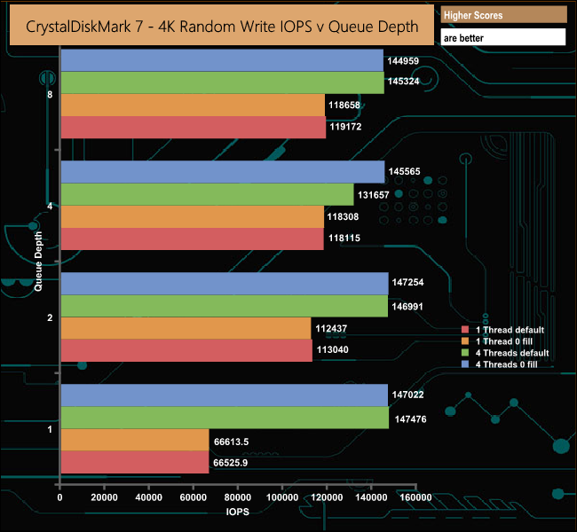 The official 4K random write figure for the 480GB drive is up 20,000 IOPS (in Steady State). The best figure we could see from our CrystalDiskMark queue depth testing out of the box was 147,476 IOPS using four threads at a QD of 1.