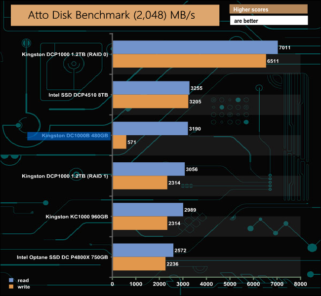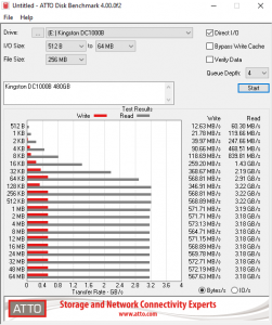 Kingston quote Sequential figures for the drive as up to 3,200MB/s for reads and 565MB/s for writes. We could confirm both figures using the ATTO benchmark with the review drive producing a read figure of 3,190MB/s with writes at 571MB/s.