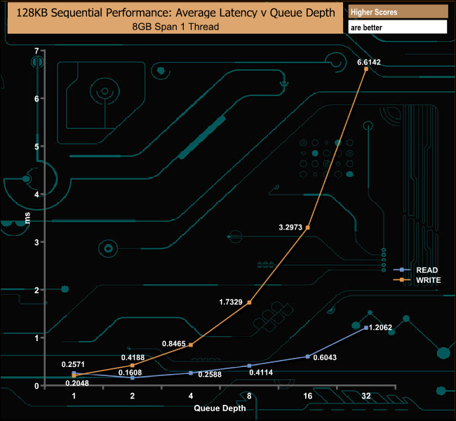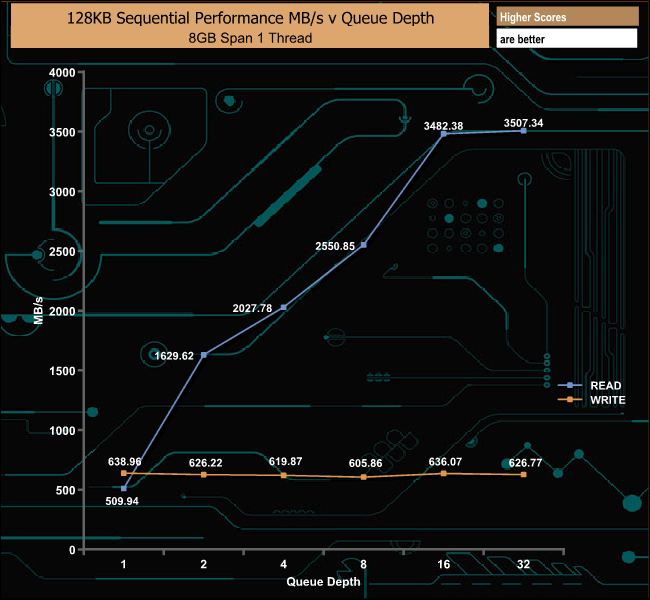 In our 128KB Sequential tests, we got result figures that bettered the official numbers for both reads and writes. The read result of 3,507MB/s is some 307MB/s better than the official figure while the tested write figure of 638MB/s is 73MB/s faster than the official figure.