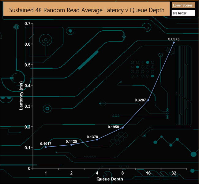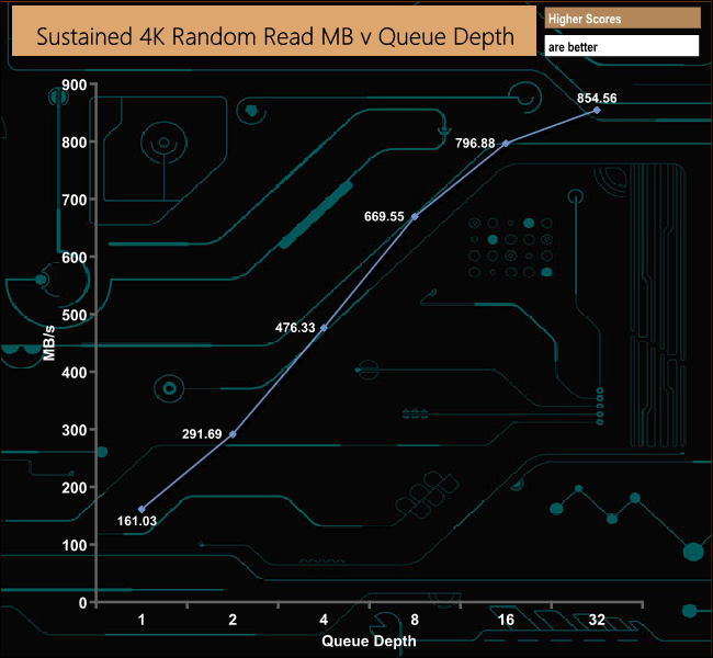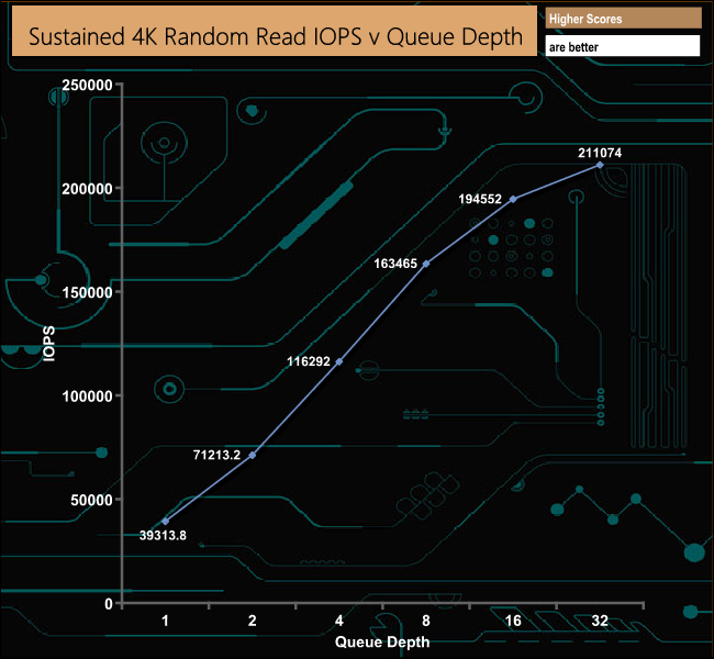 Kingston rate the 4K random read performance of the 480GB version of the DC1000B as up to 205,000 IOPS (with the drive in a Steady State). With our four-threaded tests we were able to squeeze a bit more out of the drive, 211,074 IOPS, (at a QD of 32) when fresh out of the box.
