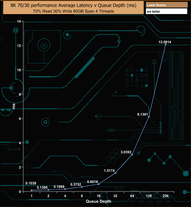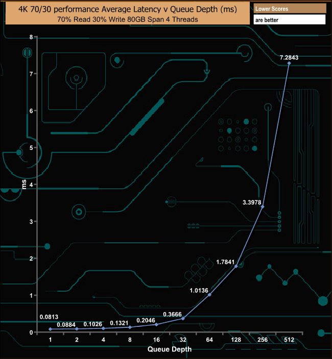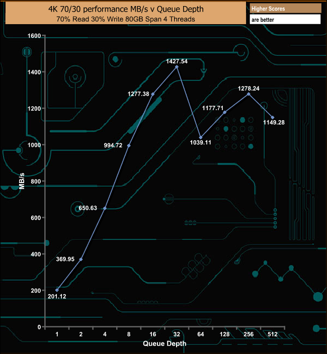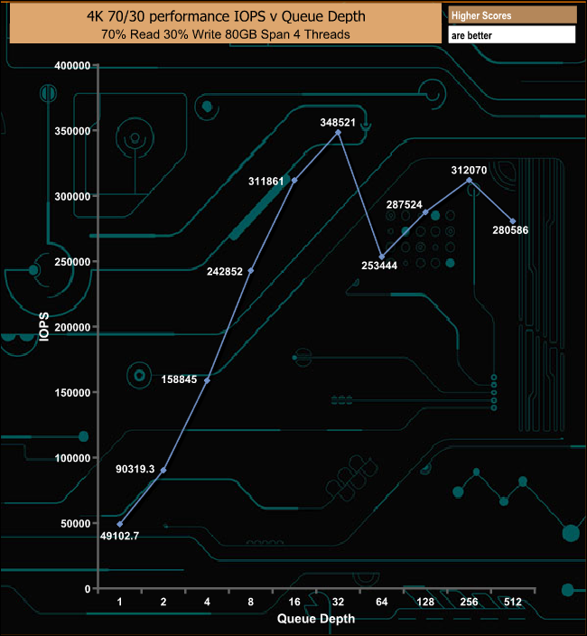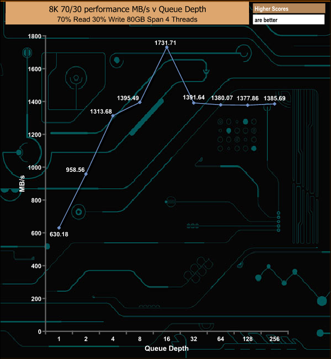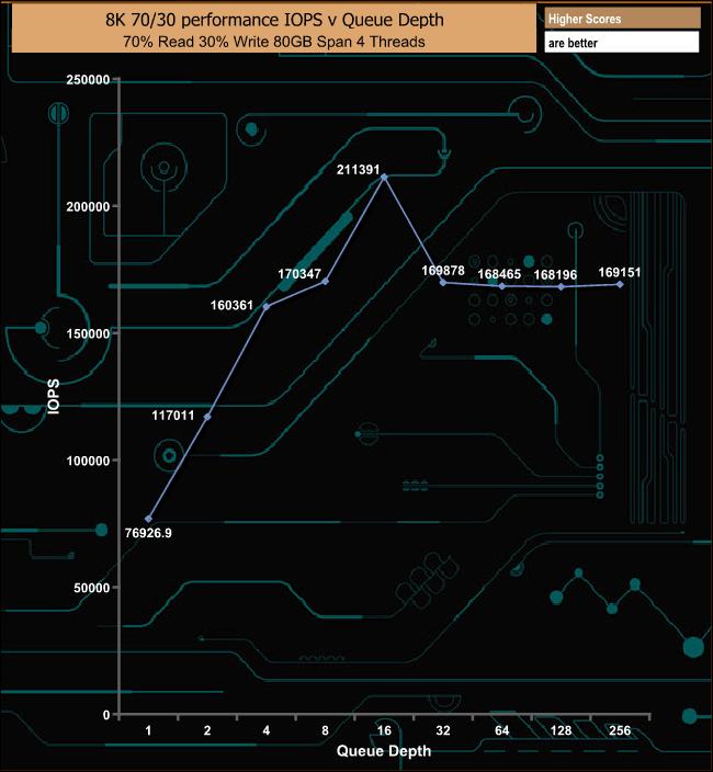 In the 8K test the peaks earlier than the 4K test at a QD of 16. As with the 4K 70/30 test the performance drops off but this time is much more consistent through the remainder of the test.