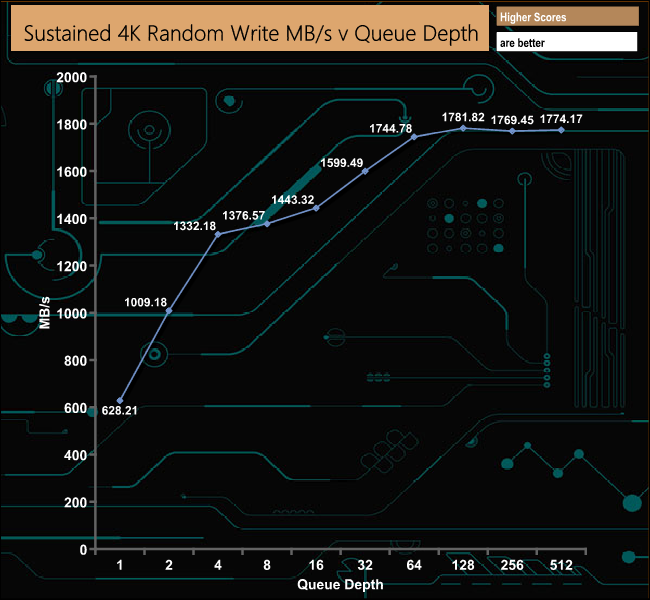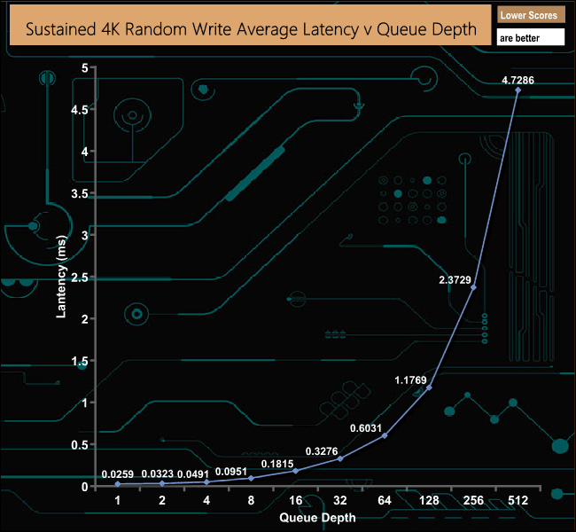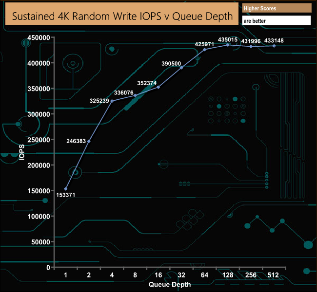 The 1.92TB DC1000M is officially rated as up to 205,000 IOPS for random writes which, after testing the drive with our 4-threaded tests seems to be a very conservative figure as the drive produced a peak of 435,015 IOPS at a queue depth of 128. Apart from QD1 (153,371 IOPS), the drive bettered the official maximum IOPS rating through every tested QD.