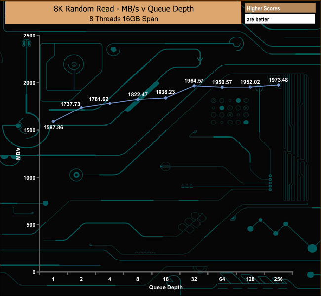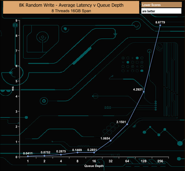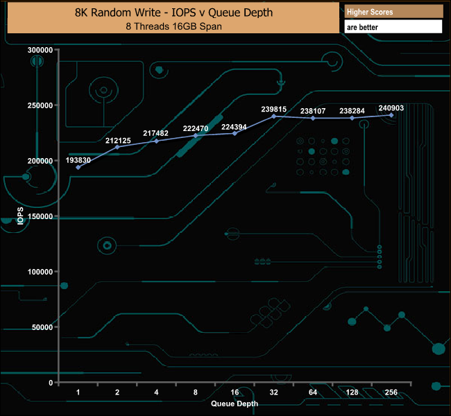 In the 8K write test, the DC1000M peaked at the end of the test run at 240,903 IOPS at QD256. Using 8K data blocks the drive is, after QD1, pretty consistent in its performance from QD's 2 to16 and again from QD32 to QD256.