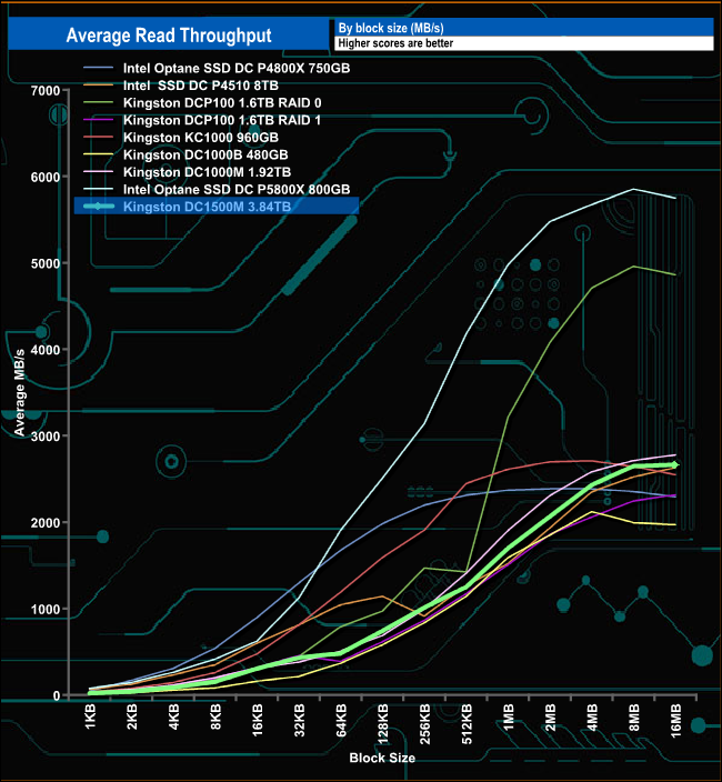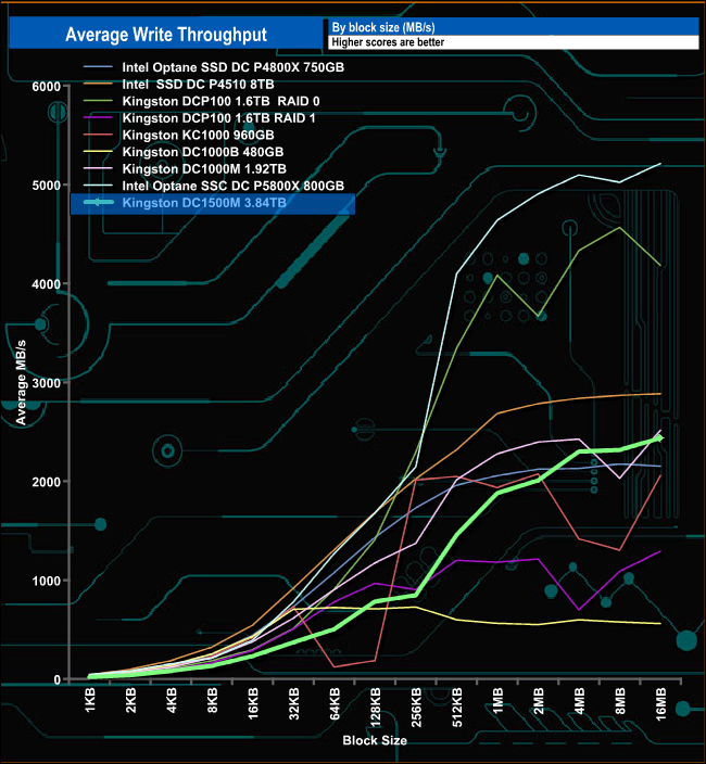 In our read throughput test, the DC1500M peaked at 2,663MB/s at the 16MB block mark, short of the official maximum of 3,100MB/s.