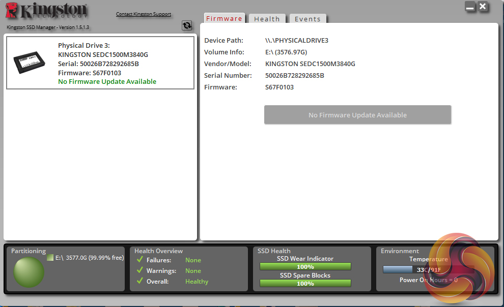 Kingston’s SSD management software utility is simply called SSD Manager. With it, you can monitor the health of the drive and how it’s being used, check the drive’s SMART data (including reliability tracking, usage statistics, life remaining, wear levelling and temperature) and update the firmware.
