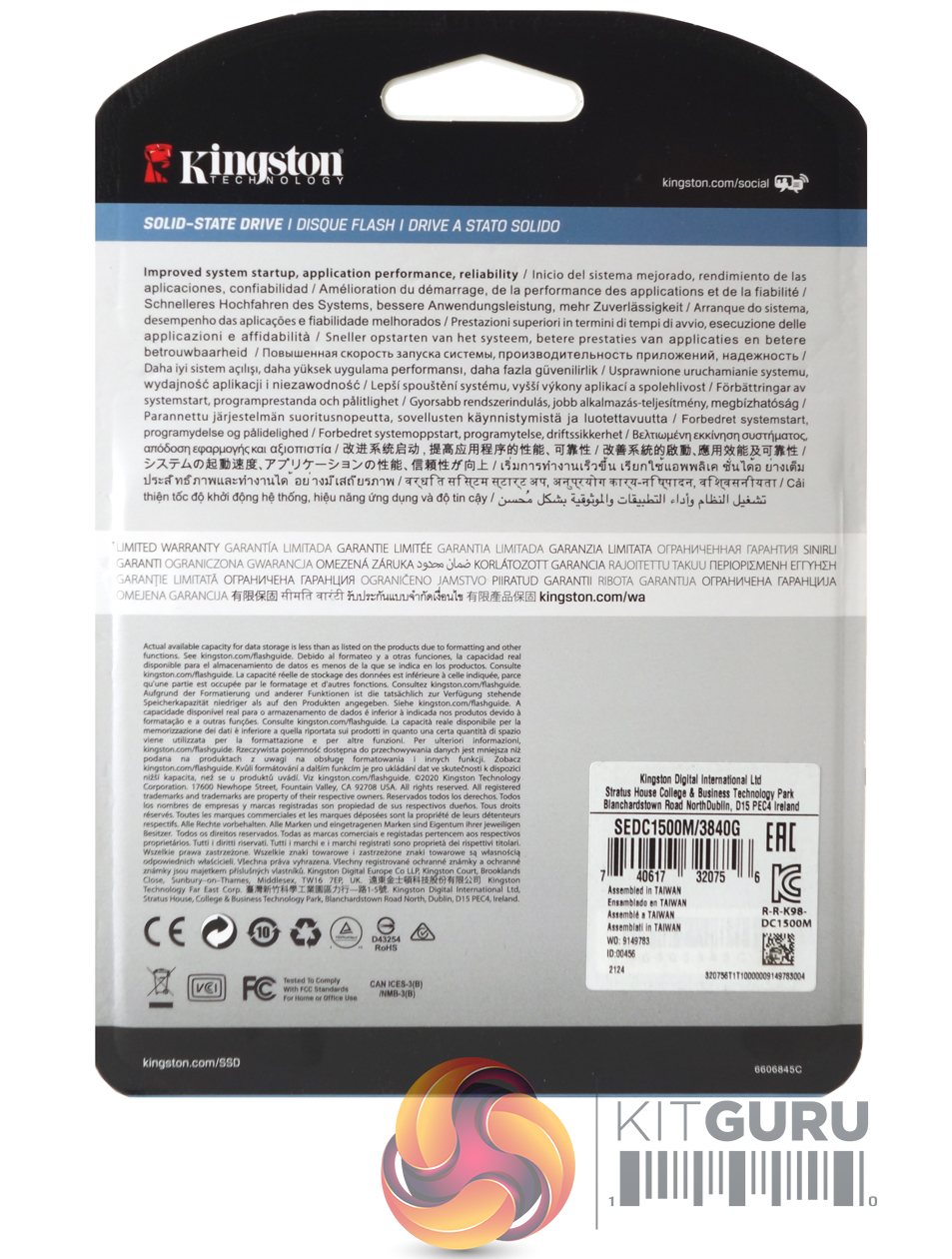 The DC1500M’s blister pack has the drive’s capacity clearly labelled on the front along with which market segment (s) the drive is aimed at and a logo that displays the 5-year warranty that Kingston backs the drive with. The rear of the packaging has multilingual marketing and warranty notes on it.