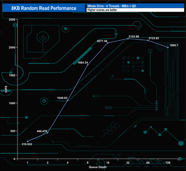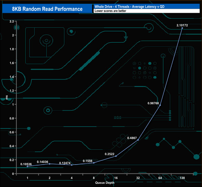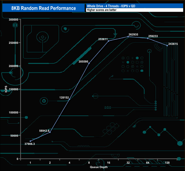 As the DC1500M has been designed for use in data centres we also tested the drive using 8K data. In our read test, the drive climbed steadily through the tested queue depths, topping out at 262,93 IOPS (QD32) before slowly dropping back to finish the test run at 243,615 IOPS at QD128. Once again the low latencies are worthy of note.