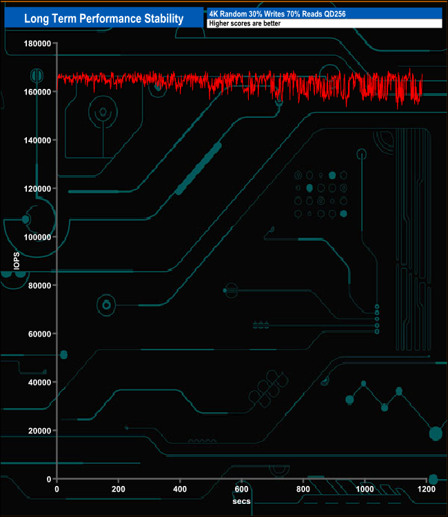 For the long-term performance stability test, we set the drive up to run a 20-minute 4K random test with a 30% write, 70% read split, at a Queue Depth of 256 over the entire disk. The 15.36TB DC3000ME averaged 163,679.01 IOPS for the test with a performance stability of 97%, a figure you should expect from a drive aimed at data centre/enterprise usage.