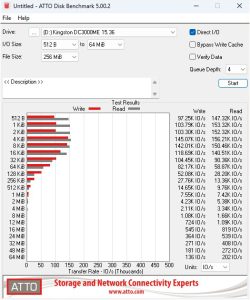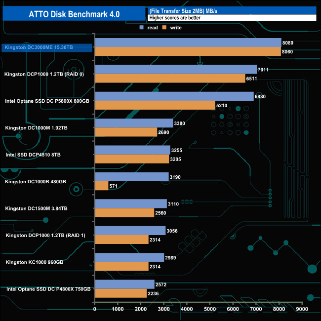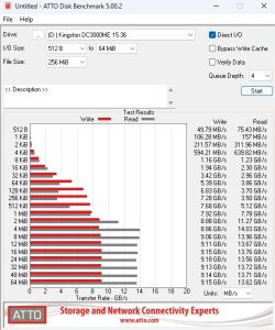 Kingston rates the Sequential performance of the 15.36TB version of the DC3000ME as up to 14,000MB/s and up to 9,700MB/s for Sequential read and writes, respectively. Using the ATTO 4 benchmark, we couldn't get close to those figures with test results of 8,080MB/s for reads and 8,060MB/s for writes. However, those figures are the fastest we've seen for any drive we've tested that's aimed at the data centre/enterprise market segment.