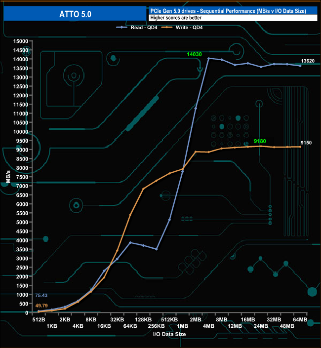 ATTO 5 brings new features, enhancements and changes for more accurate testing of the latest drives. Using this version of ATTO, we confirmed the official Sequential read figure with a peak test result of 14,030 MB/s (4 MB data size). When it came to writing performance, however, we still couldn't quite reach the official maximum of 9,700MB/s, with a peak test result of 9,180MB/s (24MB).