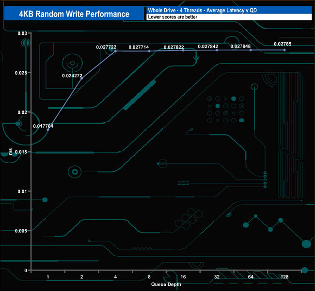 Kingston rates the 4K random read performance of the 15.36TB version of the DC3000ME as up to 2.7M IOPS. Using our 4-threaded testing, we couldn't get close to that figure; the best we saw was 439,018 IOPS (1,799.06MB/s) at QD128. Also worthy of note is the low-latency performance.
