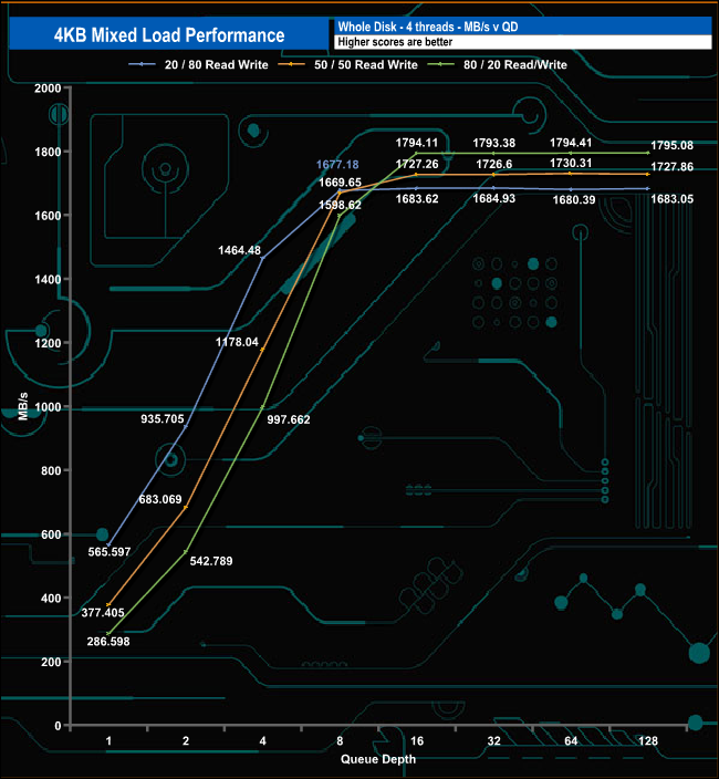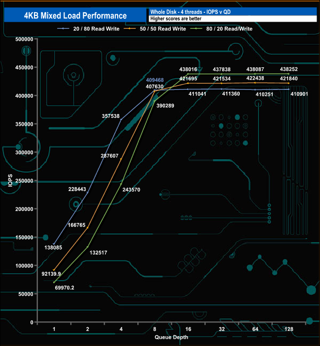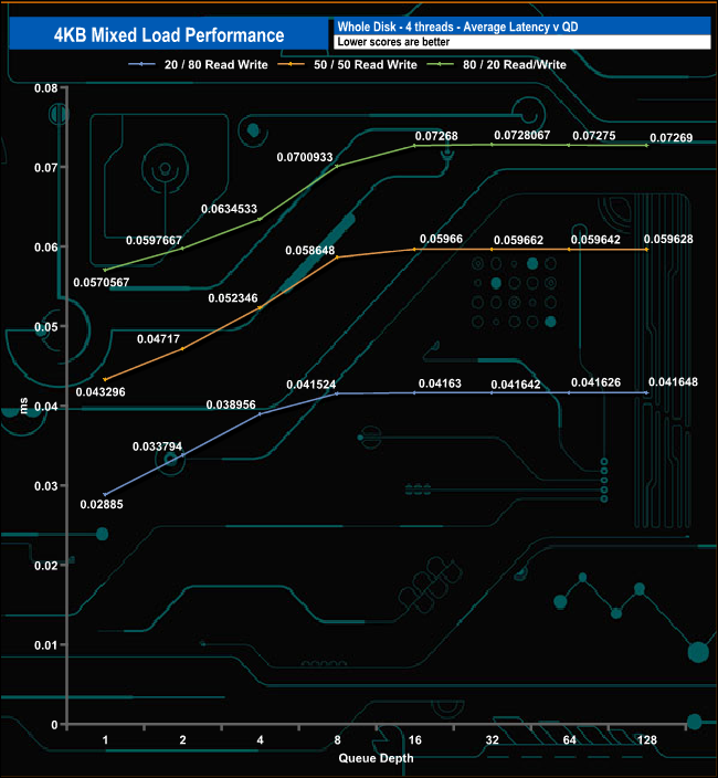The DC3000ME has been designed to deliver high I/O performance at low latencies for mixed workloads. Our mixed load testing confirmed both of these aims, particularly at lower queue depths.