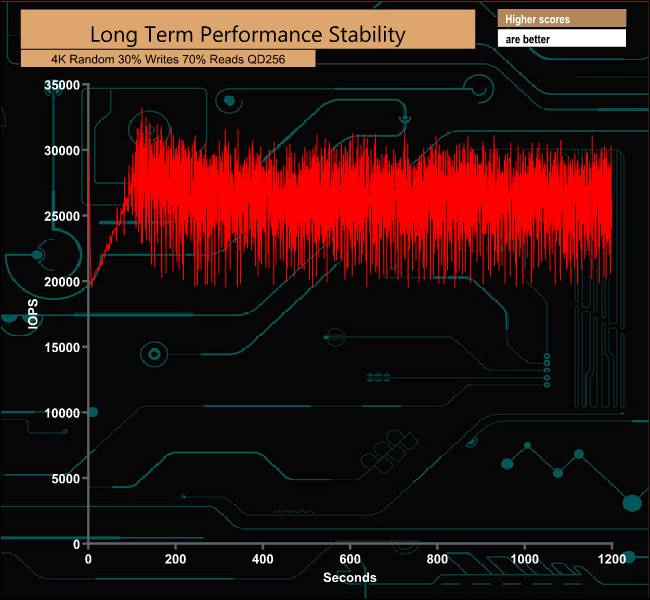 We ran a 20-minute 4K Performance Stability test on the DC400 using a 30/70 split of writes and reads respectively at a heavy queue depth of 256. At this queue depth, the drive has a stability of 74% with an average IOPS figure of 24,047 IOPS.