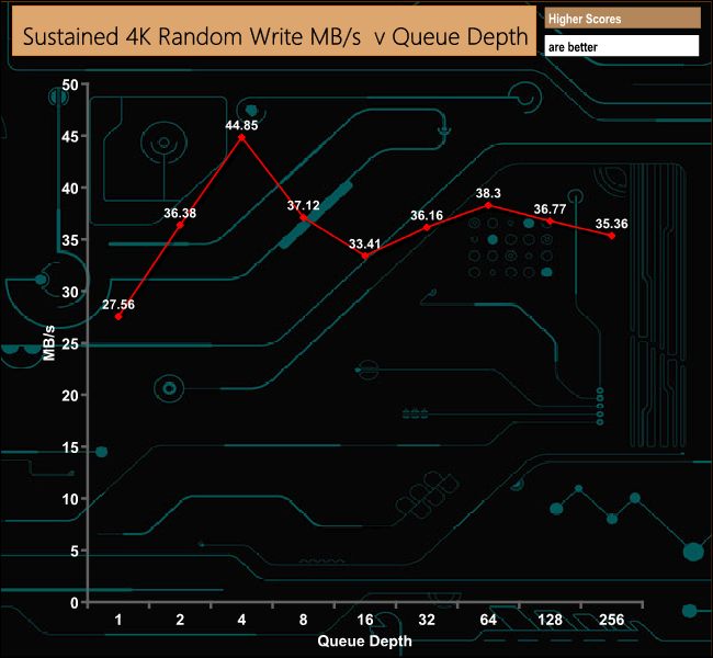 The drive's sustained random write performance isn't as consistent as its random read performance, peaking at 44.85MB/s at a queue depth of 4.
