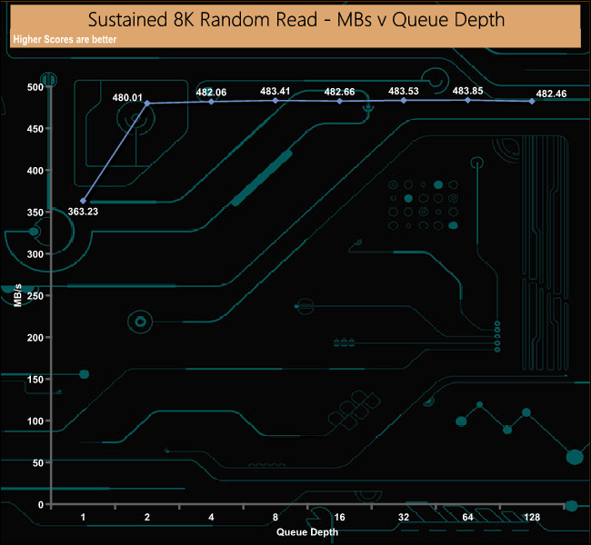 A high degree of data centre work is done with 8K data so we tested the drive at this data level (8 threads, 16GB span) to see how it would perform. The read performance peaks at 59,063 IOPS (483.85MB/s) at a QD of 64. Once again after the initial burst to QD2, it remained very consistent across the tested queue depths.