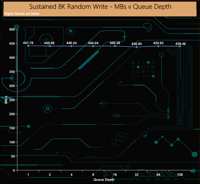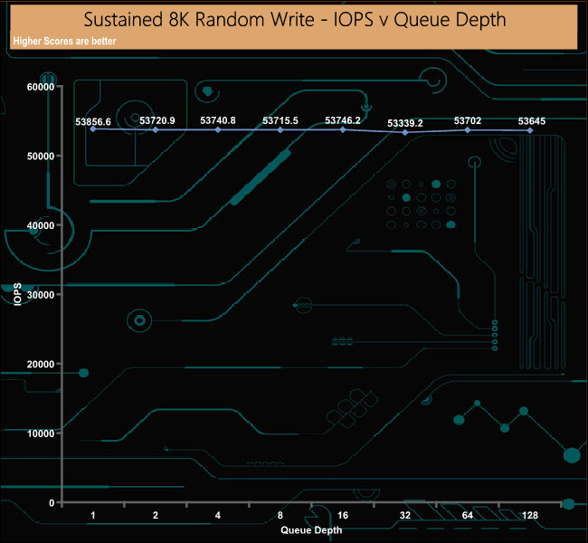 In the 8K random write test, the drive peaked at 53,856 IOPS (441.19MB/s) right at the start of the test run at QD1. Once again the drive's performance remained very consistent throughout the test run, which is what you should expect from a drive aimed at being used in a data centre environment.