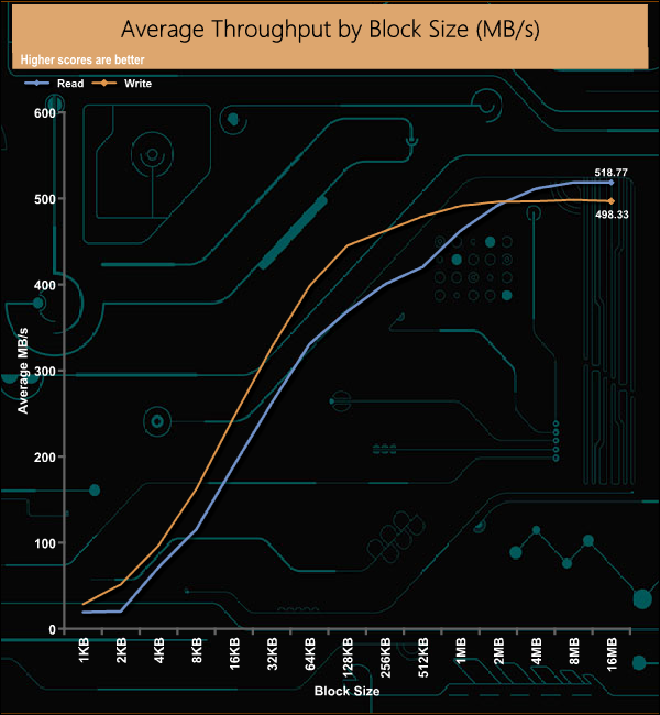 Peak throughout performance came at the end of the test for both reads, 518.77MB/s and writes 498.33MB/s, both bandwidth figures were shy of the official maximum figures of 560MB/s and 525MB/s for reads and writes respectively.